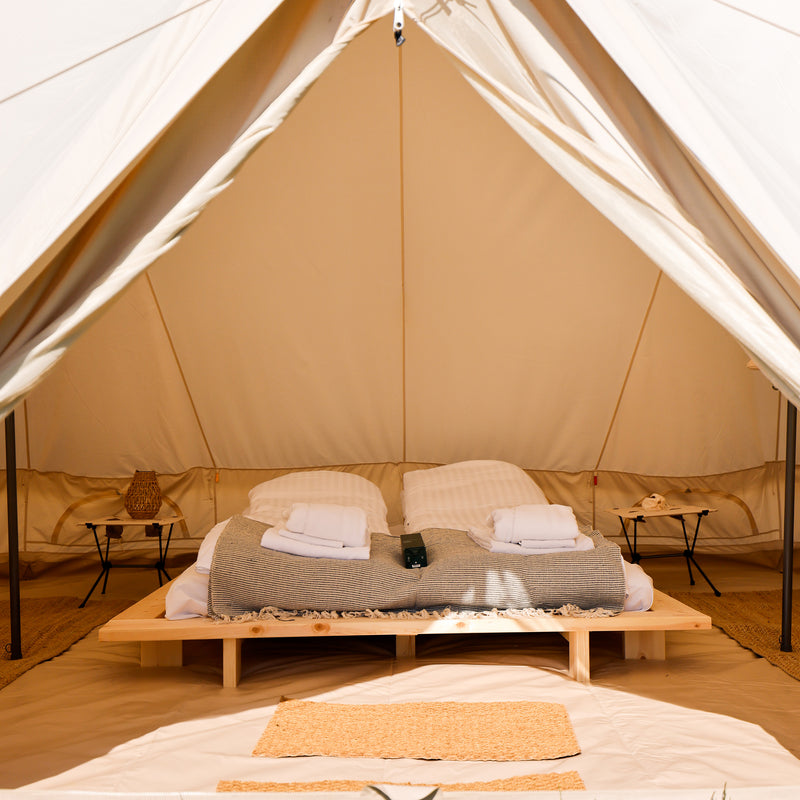 high-comfort glamping area with real beds, quality duvets, and morning